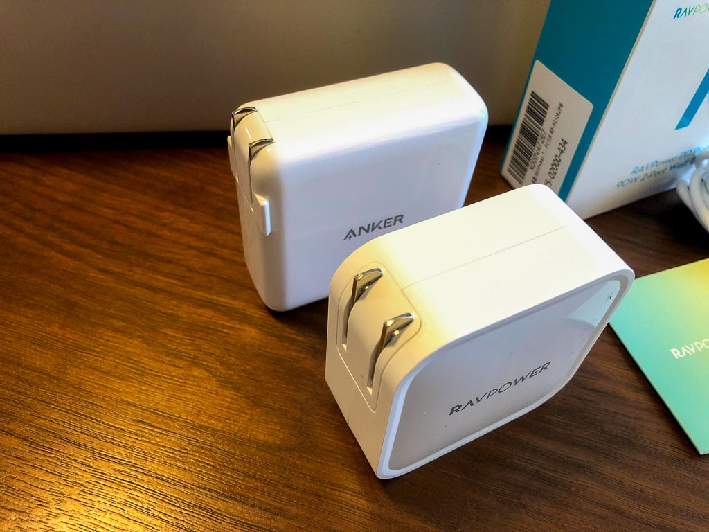 また、高出力・コンパクトな充電器としてAnker PowerPort Atom PD 2と比較をしてみました。カタログ値でコスパを考えるとRAVPowerのほうに分がありそうですね。
