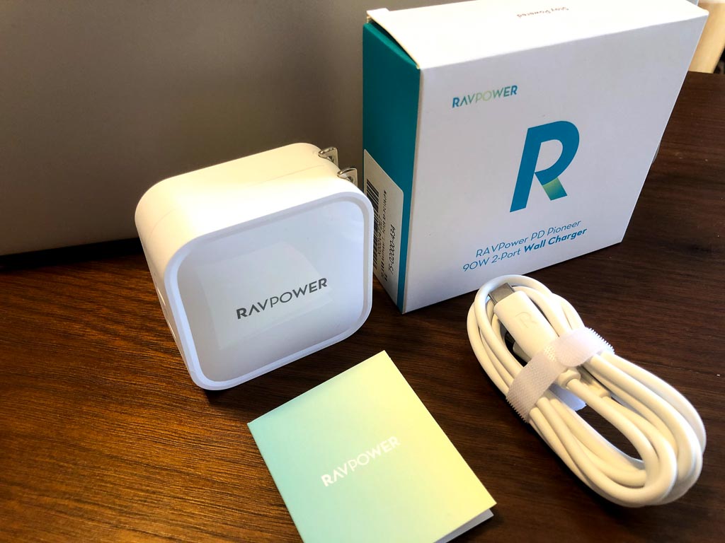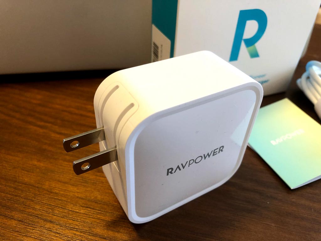 Ankerもそうですが、RAVPowerも外装がきれいですね。本体もシンプルな作りでいい感じです!内容物は本体と簡単な説明書、そしてUSB Type-C – Type-C のケーブルが付属しています。本体のプラグ部分は折りたためるようになっているので持ち運びやすさにも配慮されています。