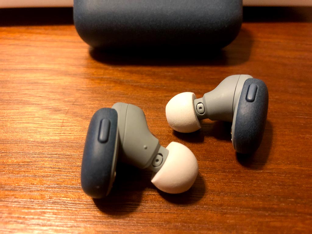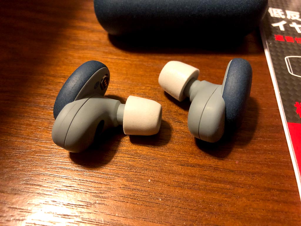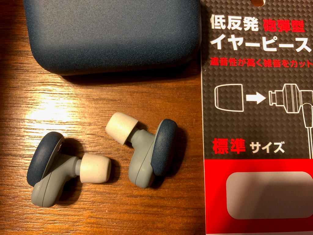使い心地は良好で左耳も外れることがなくなった。しかし、致命的だったのはイヤーピースが長すぎて充電ケースの蓋が閉まらないことで、残念ながら不採用としました。