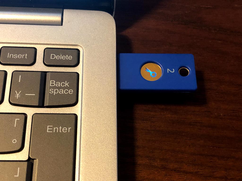 セキュリティキーとはパソコン自体へのログインやWebサービスへのログインを行う際に使うツールであって、上の写真のようなUSBの形をしていたりします。ログインの際に使われる手段として一般的な「パスワード認証」はそのパスワードを本人しか知らないというところを利用して本人確認していますが、セキュリティキーはそれ自体を本人が持っていることを前提に本人性を確認しています。